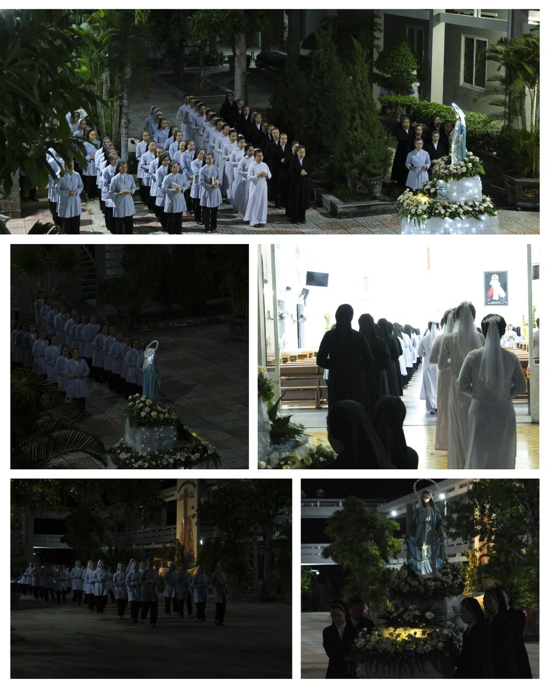 Lúc 18 giờ, cộng đoàn quy tụ tại khuôn viên Hội dòng. Nghi thức cung nghinh tượng Mẹ mở đầu buổi dâng hoa. Đoàn rước trang nghiêm tiến bước trong lời ca dâng tiến. Cùng tiến bước trong đoàn rước có sự hiện diện của chị Phó Tổng Phụ trách, quý chị trong Ban Hội đồng Dòng, quý chị cao niên cùng toàn thể chị em trong Hội dòng.